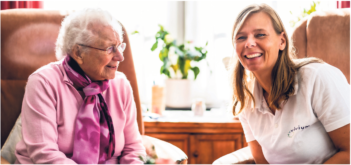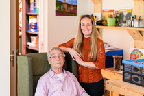 Afke Mengerink (45) werkt pas net bij Vivium in het wijkteam. Ze studeert hbo-verpleegkunde en is nieuw in de zorg. ‘Maar ze pakt het snel op, hoor’, heeft mevrouw Annie Keuker-Kamerling gemerkt. Met zorg aan huis woont deze 97-jarige dame zelfstandig in Laren. Lees hier het hele verhaal van Afke en mevrouw Keuker-Kamerling.