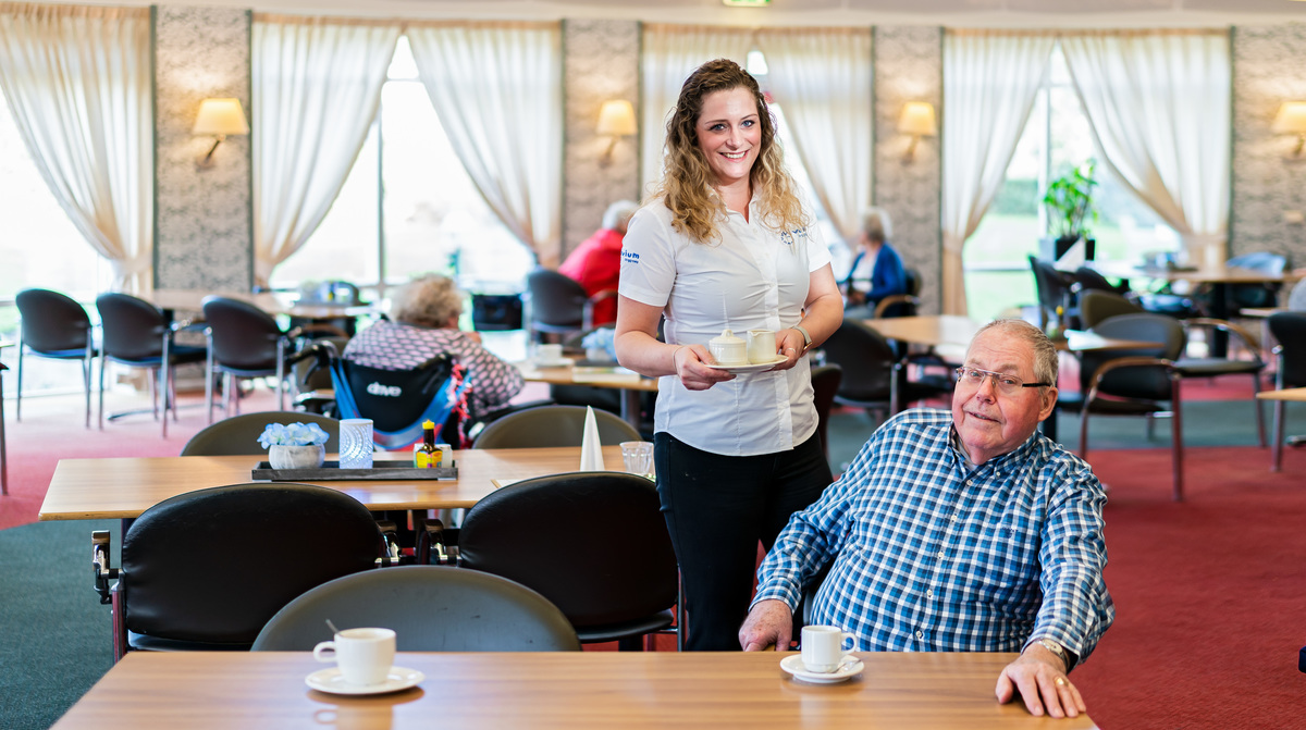 Anton Engels (74) ontmoet medewerkster Jennifer Boll (31) in het restaurant van Vivium Oversingel in Weesp. Hij geniet hier bijna dagelijks sinds zijn verhuizing naar een Zorgeloos wonen- appartement. ‘Het loopt hier perfect’, knikt hij vol lof naar haar over de gastvrijheid. ‘Echt! Alsof ik hier al jaren kom.’  Lees hier het hele verhaal van Jennifer.