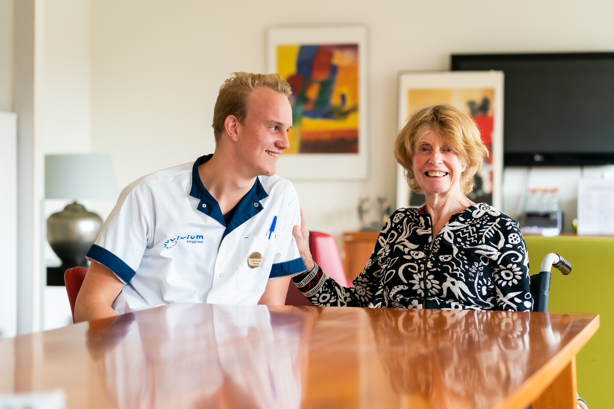 Twee weken verblijft ze nu bij Vivium Naarderheem om te revalideren na een gebroken heup. Reikhalzend kijkt Marijke Confurius (76) ernaar uit om weer lekker buiten te fietsen. Tot die tijd is het veel oefenen en Fries praten met helpende Lútsen de Haan. ‘Da’s fijn even wat anders.’ Lees hier het hele verhaal van Lútsen.