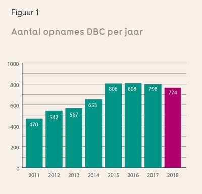 In 2018 werden 774 revalidanten opgenomen voor geriatrische revalidatie zorg (GRZ), dat waren er 24 minder dan in 2017. Veruit de meeste van hen werden verwezen door het ziekenhuis, slechts 3,5% kwam vanuit huis via het assessment door de geriater op de SEH. In de figuur rechts ziet u de ontwikkeling van het aantal sinds 2011. Klik op de figuur om te vergroten.