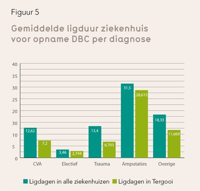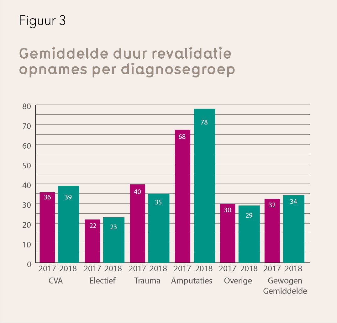 Onze opnameduur is over de laatste jaren vrij constant en fluctueert rond de 35 dagen. In 2018 nam de gemiddelde opnameduur licht toe, waarschijnlijk doordat wij in dat jaar meer amputatie patiënten hebben opgenomen (17 in 2018 versus 4 in 2017). Deze patiënten hebben in het algemeen een langer revalidatietraject nodig om veilig thuis te kunnen zijn. Het zorgpad amputatie is in 2017 gestart, in samenwerking met Merem en Tergooi. De gebundelde expertise in dit zorgpad leidde tot concentratie van zorg voor deze doelgroep in Naarderheem. In 2018 nam ook de opnameduur van de CVA groep toe. Daarentegen is er een daling in de opnameduur van de trauma patiënten. Dit geeft aan dat het zorgpad met de GTU (Tergooi) goed werkt, deze kwetsbare patiënten zijn snel weer thuis na een fractuur.