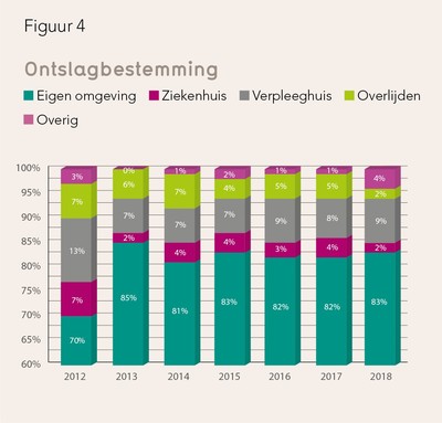 In 2018 ging 83% van onze revalidanten terug naar huis. Dat is een percentage, waar wij best trots op zijn. We zien ook dat in 2018 het percentage overige ontslagbestemmingen is gestegen: 7 revalidanten gingen vanuit GRZ naar de Medisch Specialistische Revalidatie (Merem) en 18 revalidanten zijn ‘afgeschaald’ van GRZ naar ELV hoog complex. De reden was dat hun revalidatietraject afgerond werd, maar ontslag naar huis (nog) niet veilig was. De vraag is of dit in de toekomst Respijtzorg moet zijn. Een vraag om uit te zoeken en zo nodig te bespreken met zorgverzekeraar en gemeenten.