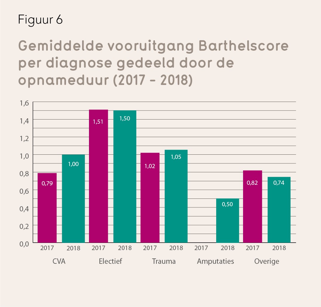 Het meten van de kwaliteit van onze GRZ zorg doen we op verschillende manieren. Wij houden de vooruitgang gedurende de opname bij door middel van Barthelscores bij opname en ontslag. Kwaliteits-indicator 2 is de gemiddelde vooruitgang op de BI/opnameduur. In figuur 6 rechts ziet u daar een grafische weergave van. Vergeleken met 2017 lijkt deze indicator te zijn verbeterd voor de doelgroep CVA. Dit zou betekenen dat we hier meer toegevoegde waarde hebben gecreëerd met de revalidatiebehandeling. Het is echter nog niet geheel duidelijk wat deze indicator precies zegt over onze GRZ. Wij willen daar de komende tijd ook verder mee. Welke indicatoren zeggen iets over onze kwaliteit van zorg? Hoe kunnen we dat meten?
