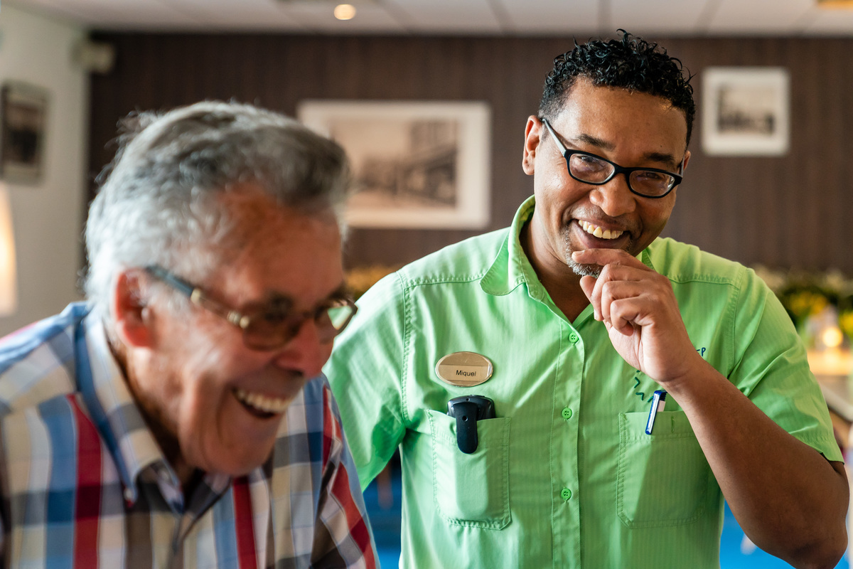 Eén van hen is Ruud Schipper (91), die met Parkinson en na het overlijden van zijn vrouw, verhuisde naar Godelinde in Bussum. ‘Ik ben hier nu, dus ik ga er nog wat van maken.’ Benito knikt: ‘Meneer lacht elke dag. Ik hou van zijn humor.’ ‘Ja, we klikken wel’, beaamt meneer met een blik naar Benito. ‘Hij heeft net zo’n positieve instelling en is heel hulpvaardig.’ Mannen in de zorg zijn schaars. Jammer, formuleert hij zijn waardering voorzichtig, want een man aan het bed is toch anders; ook al zijn man en vrouw gelijk en is elk mens uniek.