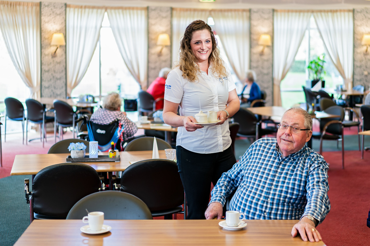 ‘Wat Jennifer doet, is meer dan koffieschenken’, heeft meneer al lang gezien. ‘Ze lost voorvallen in het restaurant kundig en naar ieders tevredenheid op.’ Het zorgaspect in de horeca hier spreekt Jennifer aan. ‘Na een val, help je iemand even naar huis. En als iemand niet komt eten, dan bel je even. Het is nooit saai. Elke dag is anders.’ Meneer merkt op dat ze het als team ook gezellig hebben en dat uitstralen. ‘En zij heeft echt aandacht voor je. Laatst stond ze ineens voor m’n deur met een bakje tutti frutti, dat over was. Ik at niet mee, maar ze weet dat ik dat zo lekker vind. Geweldig toch?!’