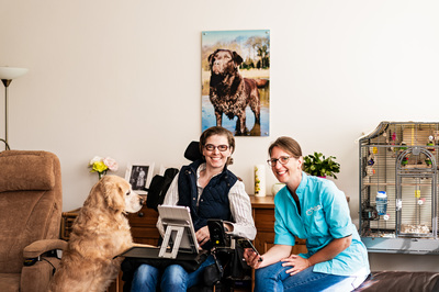 Sandra van Rosmalen (47) krijgt zorg aan huis van het Vivium wijkteam. Met wijkverpleeg kundige Marjolein van Houten heeft ze daarnaast wekelijks contact via Beeldzorg. ‘Technologie verbindt en voegt echt iets toe.’