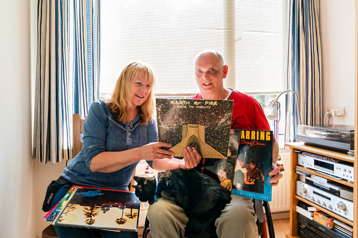 Lydia Wernsen (55) biedt met collega’s van het Vivium wijkteam Eemnes al jaren zorg aan huis bij Jos van Delft (60) vanwege zijn progressieve ruggenmergziekte. Ze houden allebei van muziek. Hij wijst op z’n platenspeler en lp’s: “Als Lydia er is, dan draaien we lekker hard jaren 60- en 70-muziek.”